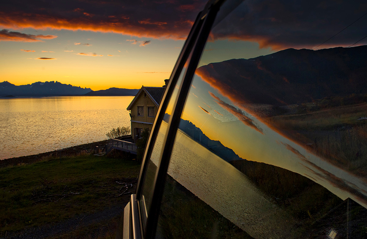 В Норвегии, где я был в составе группы, мы спешили на последний паром, когда случился необыкновенно красивый рериховский закат. Следующего парома пришлось бы ждать до утра. Размышлять было некогда еще и потому, что солнце закатилось за линию горизонта за полчаса до момента съемки, краски успели потускнеть и вот-вот могли совсем потухнуть. Фото 1 и 2 пришлось снимать, не отходя от машины.