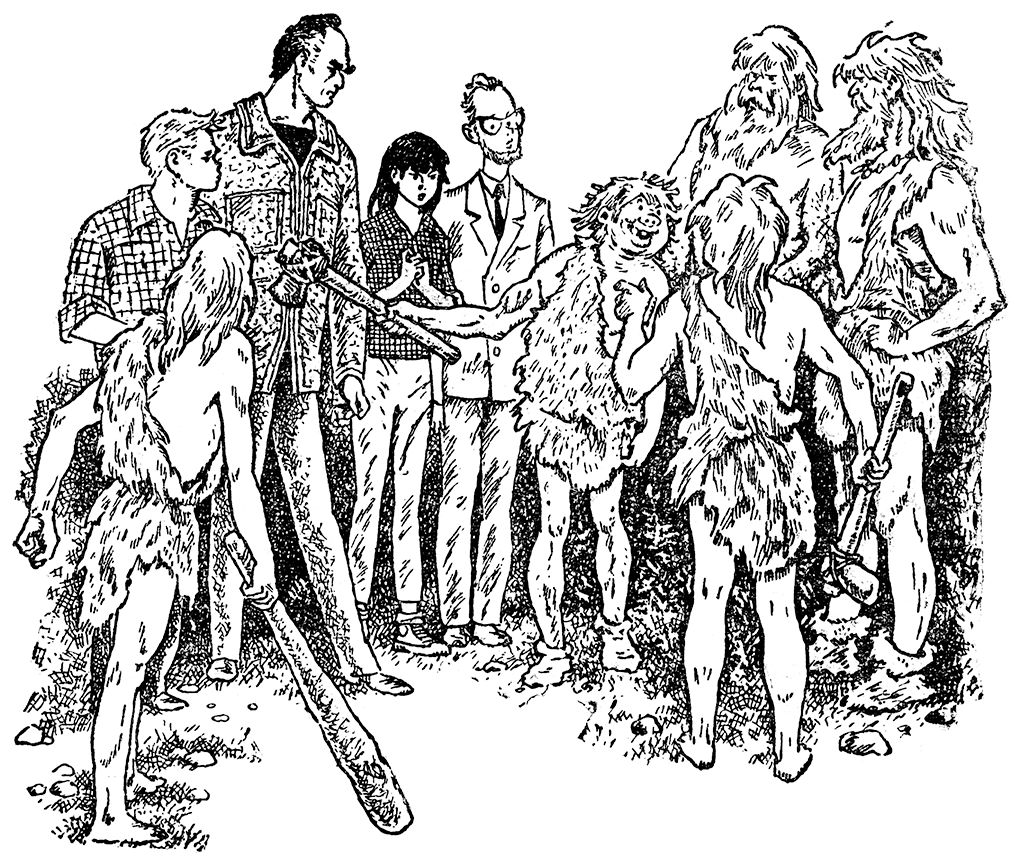 Он и вправду знал всё заранее. Едва Саня вылетел из ямы вторично и очутился рядом с друзьями, кусты зашевелились и поляну окружили небритые и нестриженые мужчины в звериных шкурах. Каждый из них был вооружён каменным топором или увесистой дубиной.