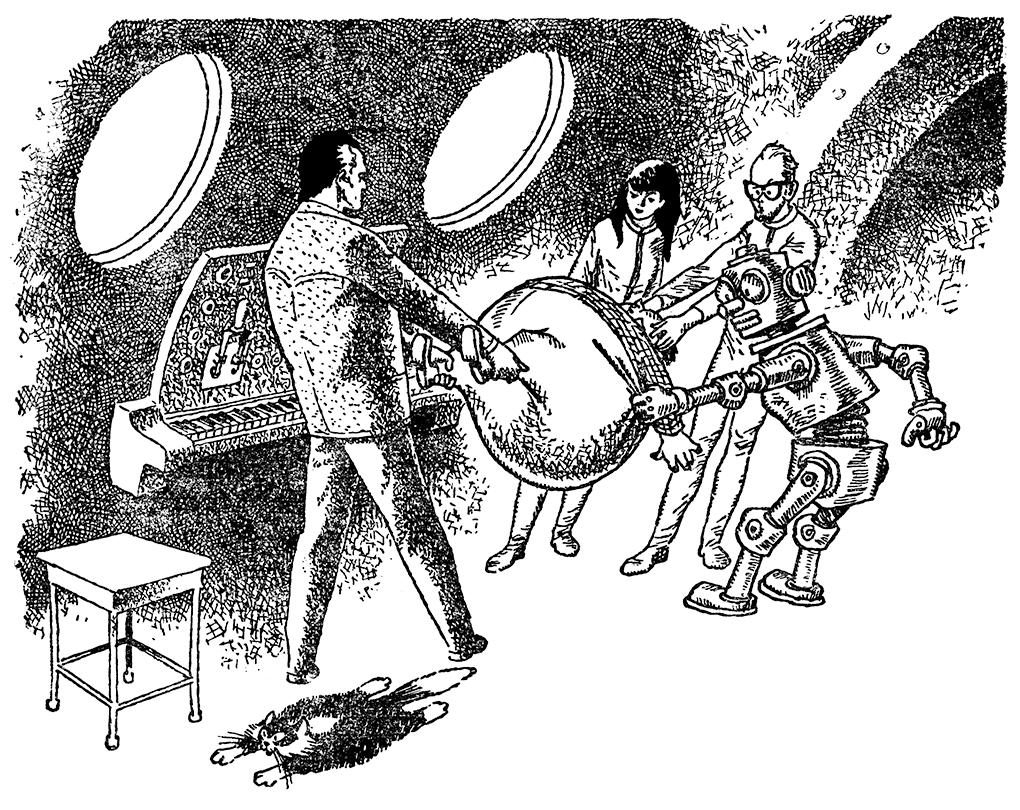 Едва «Искатель» покинул орбиту, как на одной половине корабля стало темно. Дело в том, что звездолёт сделался маленькой планетой и со стороны, обращённой к Солнцу, у него был день, с противоположной – ночь. Поэтому день и ночь поделили корабль пополам. И в правой половине стояла тьма-тьмущая, только пылали зелёные глаза кота. Петенька стоял как раз на границе дня и ночи, и одну половину его совершенно не было видно. Так и торчала у всех перед глазами одна половинка штурмана.
