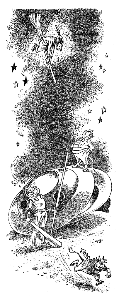 Только он это сказал, как меня подняло и понесло. Плаваю между тарелками, точно мыльный пузырь. И стальные доспехи мои легче обычного пуха. Что же это он вытворяет со мной, с храбрым рыцарем, думаю. А меня то и дело носит туда и сюда. Вот уже и ноги выше головы. А может, я потерял ориентацию, где верх, где низ.