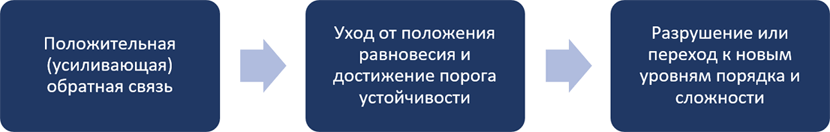 Удивительным и новым здесь является то, что усиливающая обратная связь «вразнос», уводящая систему все дальше от положения равновесия, которая всегда считалась разрушительной в механике и кибернетике, в диссипативных структурах может оказываться источником структурных перестроек и возникновения новых уровней порядка и сложности.