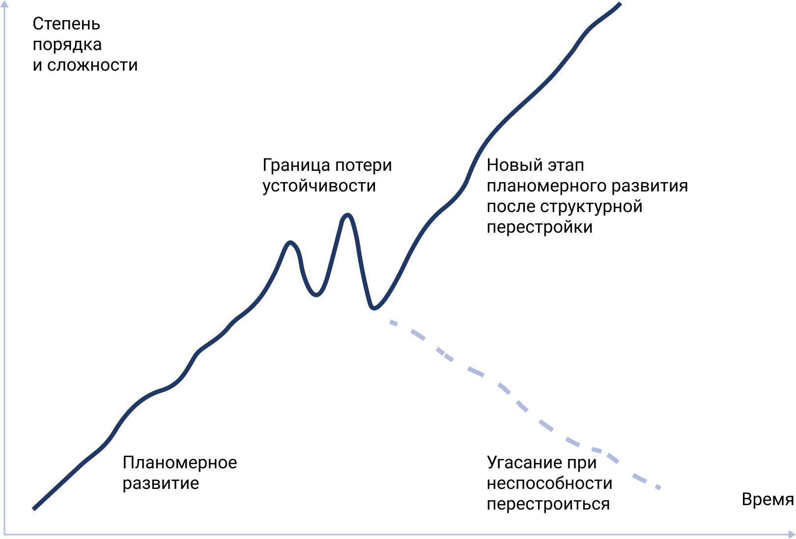 Для успешного направления бизнес-системы к желаемым трансформациям необходимо, чтобы эти вопросы возникали еще на этапах «благополучного» развития, о чем Минцберг и соавторы [Генри Минцберг, Брюс Альстранд, Жозеф Лампель «Стратегическое сафари. Экскурсия по дебрям стратегического менеджмента»] пишут: