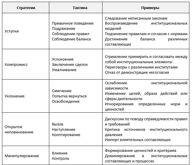 В бизнес-сообществе подходы к «разбиванию» скрижалей не столь радикальны: определенные аспекты внешних ограничений компания отбросить не может, не поставив под угрозу сам факт своего существования. Однако ряд подходов школ внешнего окружения в рамках стратегического менеджмента [Генри Минцберг, Брюс Альстранд, Жозеф Лампель «Стратегическое сафари. Экскурсия по дебрям стратегического менеджмента»] предполагает, что организация, будучи не готовой принять определенные внешние нормы, может действовать вразрез с ними, применяя определенные стратегии (см. нижеприведенную таблицу).