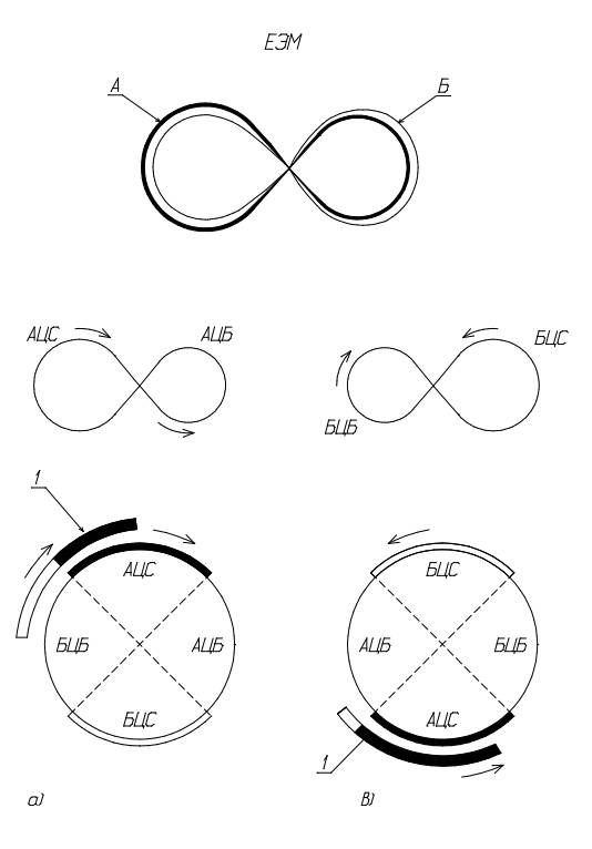 Рис.1. Единая энергия мироздания в структуре монады. А-альфа цикл. Б – бета цикл. АЦС и АЦБ – центростремительная и центробежная энергии цикла А. БЦС и БЦБ – центробежная и центростремительная энергии цикла Б. 1- проявленный отрезок энергии. а-правый цикл раскрытой монады. в- левый цикл. 1- условно проявленный монохромный лепесток.