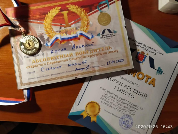 1. Коган Арсений (2003/59,54) – 105,0 кг и 1 место в абсолютке; тренер Коган А. Г.