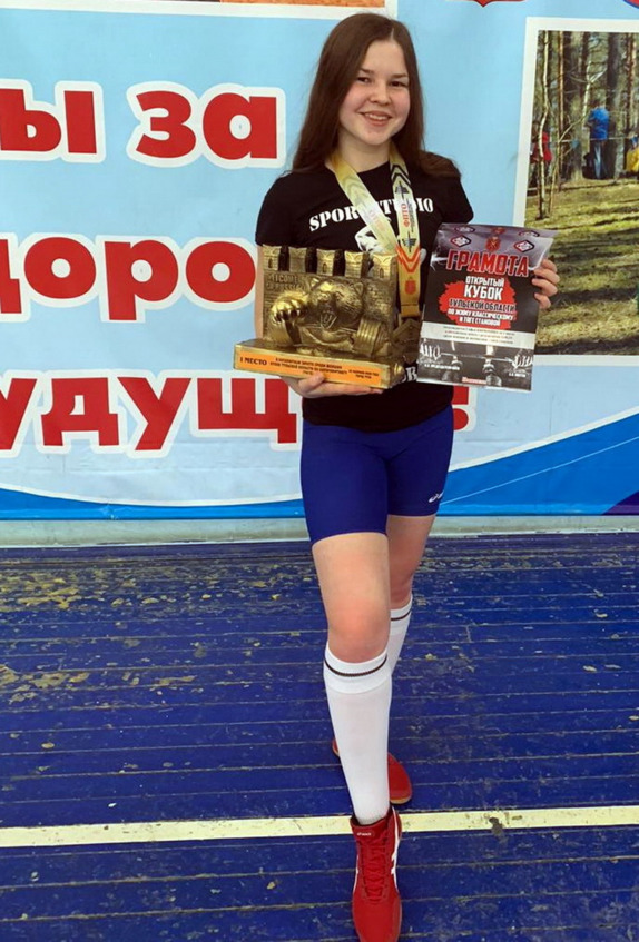 В феврале она стала абсолютной чемпионкой Тульской области в тяге с результатом 145,0 кг.