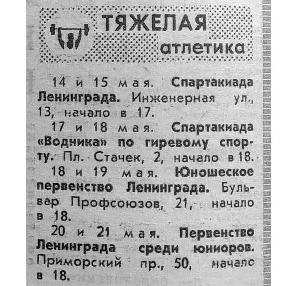 В основном данные взяты из газет: «Спортивная неделя Ленинграда», «Ленинградская правда», «Вечерний Ленинград» и «Смена». Читателю будет интересно, как раньше оповещали турниры по тяжелой атлетике в Ленинграде.