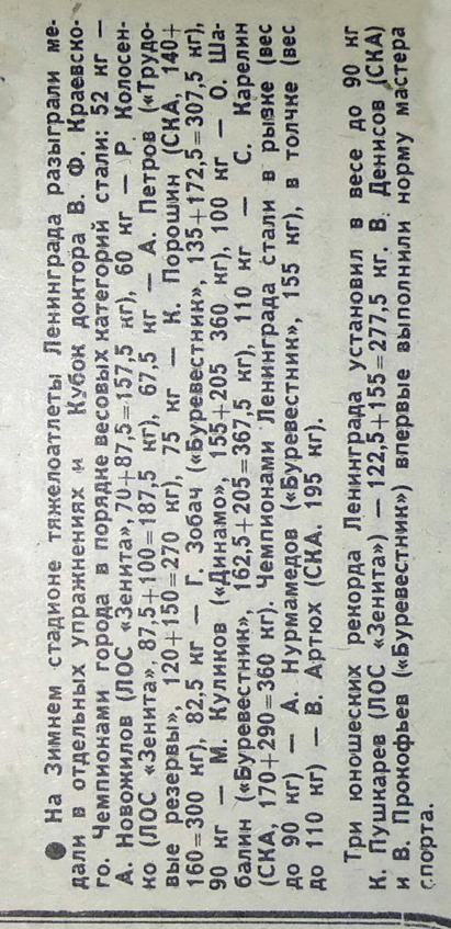 Борьба на помосте в те годы была острой и любого призера Ленинграда можно отнести к тяжелоатлетической элите нашего великого города на Неве. Читатель сам может ознакомиться с результатами чемпионов и призеров Ленинграда, рекордами города с 1960 по 1987 г.