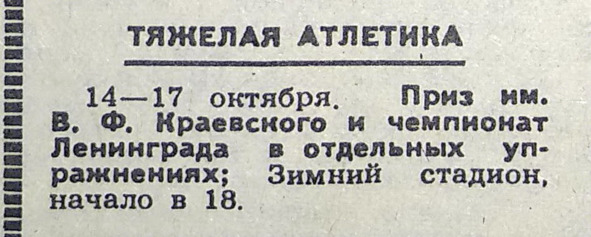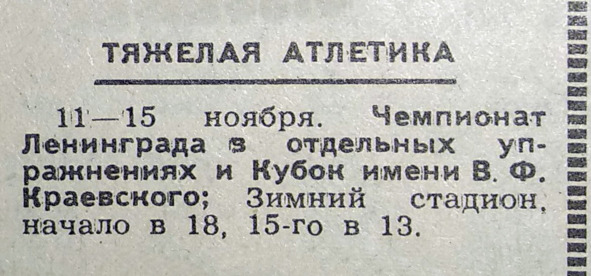 В основном данные взяты из газет: «Спортивная неделя Ленинграда», «Ленинградская правда», «Вечерний Ленинград» и «Смена». Читателю будет интересно, как раньше оповещали турниры по тяжелой атлетике в Ленинграде.