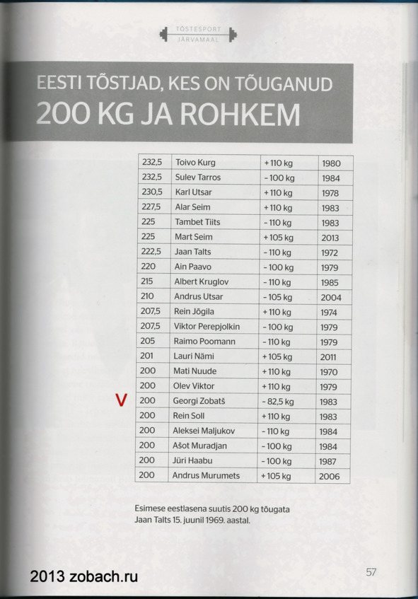 В те годы 200 кг в среднем весе были великолепным эталоном, характеризующим атлета. В Ленинграде и Эстонии в толчке 200 кг покорялись не всем атлетам даже более тяжелых весовых категорий, только чемпионы толкали больше 200 кг. И когда на штанге устанавливался вес 200 и больше, зал замирал от уважения к атлету, готовящемуся на этот вес сделать подход.