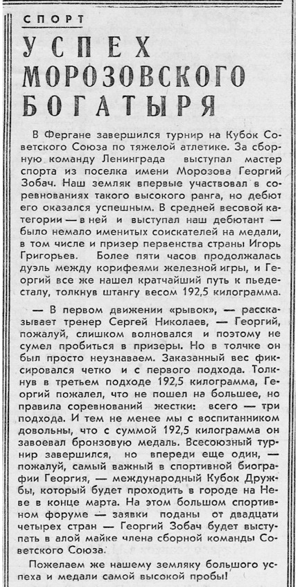 В 1979 году перед международным турниром «Кубок Дружбы» в одном номере, на одной странице посвященной спорту были две статьи. В одной статье, я проходил как успешный мастер спорта, формовщик прославленного Объединения «Кировец», а в другой, как воспитанник Ленинградского Технологического института, студент старших курсов. Вот такой приятный казус с коллективами, за которые я выступал.