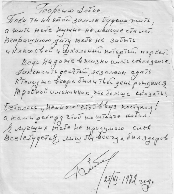 Пока ты на этой земле будешь жить,А жить тебе нужно не меньше ста лет.Вчерашнюю дату тебе не забытьи класс свой и школьный потертый паркет.Ведь надо же в жизни иметь совпадениеЗакончить десятый, экзамены сдатьК тому же вчера был и твой день рожденияТройной именинник, что больше сказать!Осталось «немного» чтоб в ВУЗ поступил!А там и рекорд чтоб по штанге побил!Я лучших тебе не придумаю словВсе сбудется, лишь бы всегда был здоров25/VI-1972