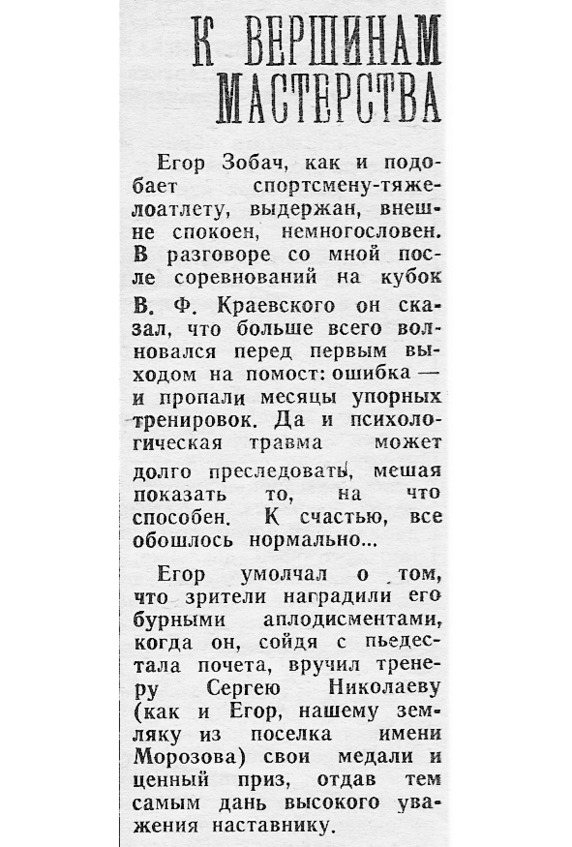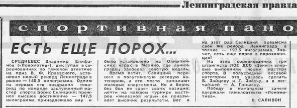 Когда вечером на следующий день я приехал домой из института, вся Морозовка уже знала, что я новоиспеченный мастер спорта СССР. Это не заслуга Виктора, это мой отец обошел весь поселок с кипой газет «Ленинградская правда» и «Смена». Обо мне написали, что я выполнил норму мастера спорта и стал серебряным призером. А через неделю в «Спортивной неделе Ленинграда» появился отчет о чемпионате города в отдельных упражнениях и протокол.