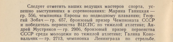 30 декабря. Очередной чемпионат ЛОС ДСО «Зенит». Мое хорошее выступление и очередная победа прошла никем незамеченной и тем более, не отмеченной. Притом, что я впервые толкнул 180 кг. Но, не мой праздник. Обидно? Да нет. Просто принимал поздравления в этот день мой сосед, коллега по команде и друг Вячеслав Надеждин. Он впервые выполнил мастерский норматив. Вся наша команда с болельщиками-друзьями праздновали его заслуженный успех и очередную веху в спортивной жизни поселка.