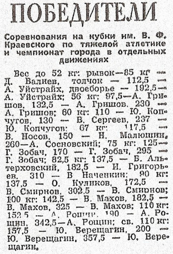 Я впервые становлюсь чемпионом города. Рывок 125,0 кг. Ттолчок 170,0 кг. Я сработал на все шесть подходов. Доволен старший тренер ЛОС ДСО «Зенита» Семен Сидорович Шульжицкий, за солидные очки в копилку команды.
