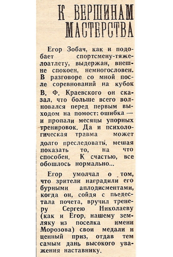 На выпускном вечере в школе, учитель физкультуры объявил, что в этом году в нашей школе только один ученик с золотой медалью. И в неловкой тишине администрации школы и поселка, сказал в микрофон: «Аттестат вручается Георгию Зобачу, выигравшему в апреле золотую медаль на Первенстве Ленинграда.» Под аплодисменты и мальчишеские крики ура я поднялся на сцену.