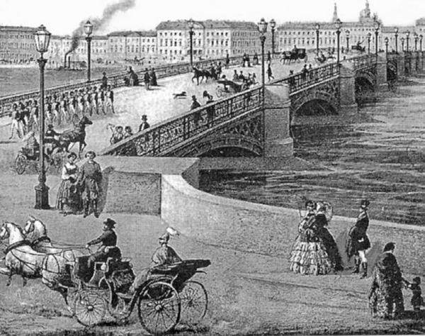 Николаевский мост со стороны Английской набережной. Литография Л. Ж. Жакотте и Гегаме по рисунку И. И. Шарлеманя. 1850-е гг.