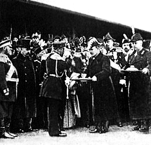 Городской голова подносит хлеб-соль командиру крейсера «Варяг» капитану 1-го ранга В. Ф. Рудневу