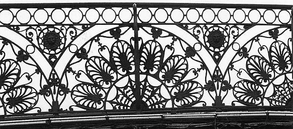В рисунке чугунных перил и ограждений преобладают часто расставленные дротики с накладной металлической арматурой из переплетенных венков, пронзенных копьевидными шестами с острыми наконечниками.