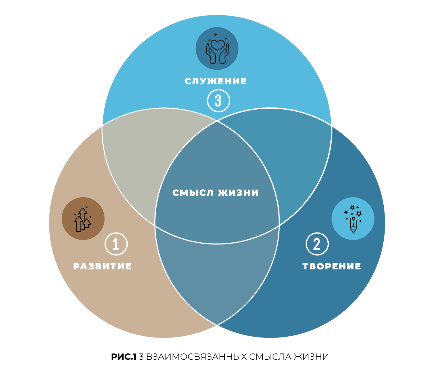 Я считаю, что основной смысл жизни и, соответственно, устойчивое счастье человека – в трех вещах (Рис. 1): в том, чтобы расти и развиваться, творить свою жизнь как самый главный шедевр по своему усмотрению и служить другим людям через раскрытие своих уникальных талантов. И эти три смысла взаимосвязаны, один без другого не существует. Невозможно создать жизнь своей мечты, не развиваясь, невозможно расти и развиваться, не реализуя свою миссию служения миру и людям в том или ином виде. Этимология слова счастье происходит от слова «со-частие», то есть «быть частью чего-то большего, чем ты». Для меня счастье – это и есть глубинно заложенная потребность человека создать что-то в жизни, большее чем он сам, то есть не быть зацикленным только на себе, а творить, делать и создавать не только для себя, но и для других людей. Мы – творческие создания и пришли в этот мир, чтобы познать опыт многогранного творчества – творения своей жизни в ее наилучшей возможной версии, создания полезных и красивых результатов своей деятельности, позитивного влияния на жизни других людей. Поэтому для меня счастье – это процесс развития, творения, служения. И это путь, со своими логическими этапами, которые необходимо пройти, чтобы полностью раскрыть заложенный в тебе творческий потенциал.