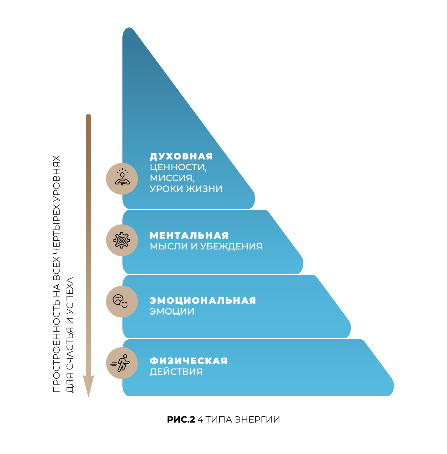 Я считаю, что истинный устойчивый успех и ощущение счастья в жизни возможны, только если человек работает со всеми уровнями своей личности – физическим, эмоциональным, ментальным и духовным (Рис.2). Когда мы понимаем, для чего мы пришли в этот мир, в чем смысл нашей жизни (духовный аспект), сонастраиваем себя ментально и эмоционально со своей миссией, ценностями и целями и при этом относимся к своему телу как к драгоценному сосуду, в котором живет наша душа, мы начинаем энергетически вибрировать на уровне, который позволяет нам создавать свою жизнь в соответствии со своими глубинными потребностями. Когда мы простроены на всех уровнях, в нашей жизни начинает происходить магия. Простроенность означает, что наши мысли, чувства и действия синхронизированы и опираются на наши ценности.