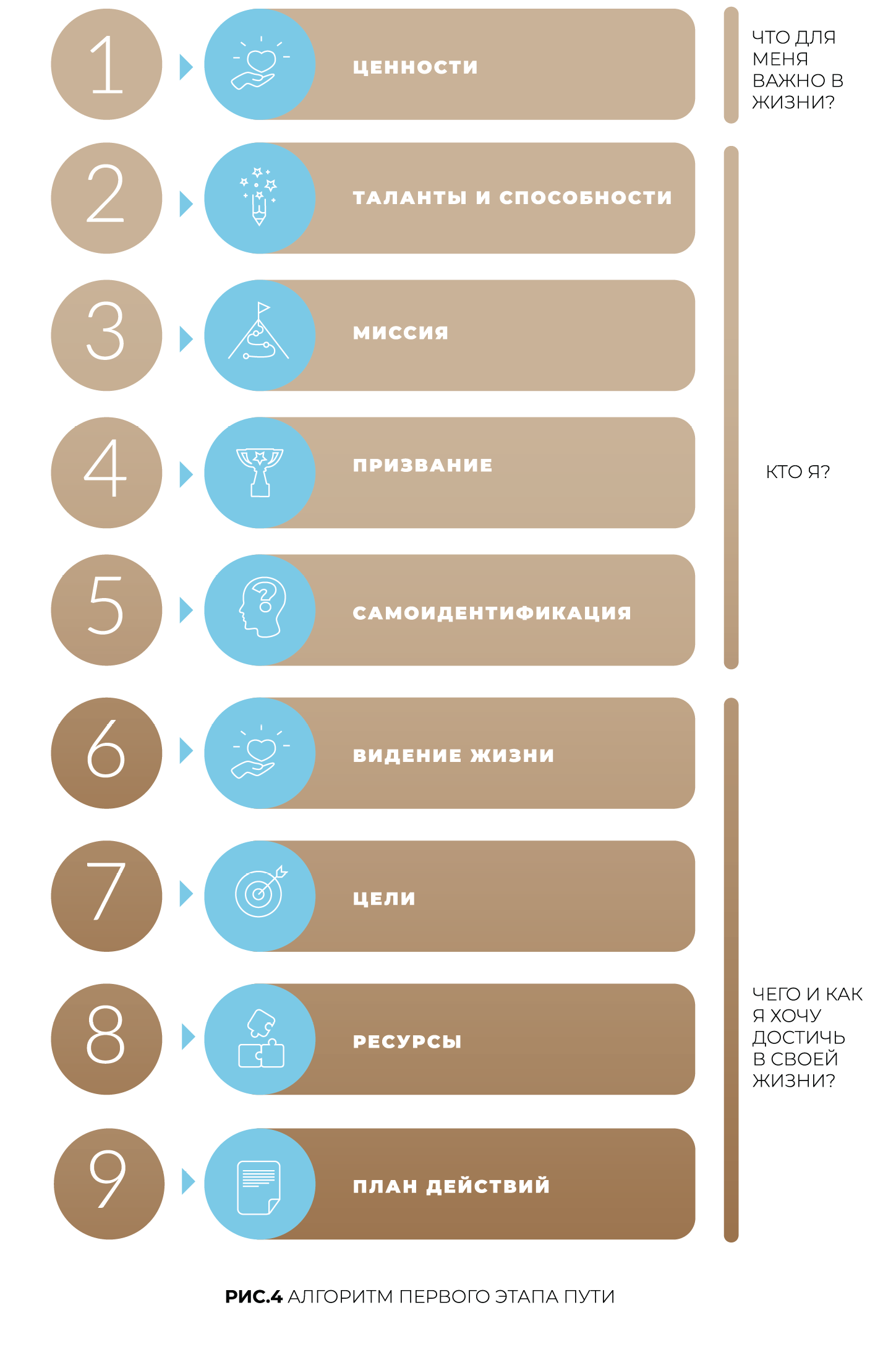 Это очень важный и духовный этап пути. Цель данного этапа – понять¸чего хочет ваша душа в этой жизни, зачем вы родились, какой опыт хотите приобрести и простроить себя в соответствии с этим глубинным пониманием. Все изменения во внешнем мире начинаются с простройки себя. Человек всегда достигает впечатляющих результатов, когда движется «изнутри вовне» – от осознания своего кредо, смысла своей жизни к внешним действиям и изменениям.