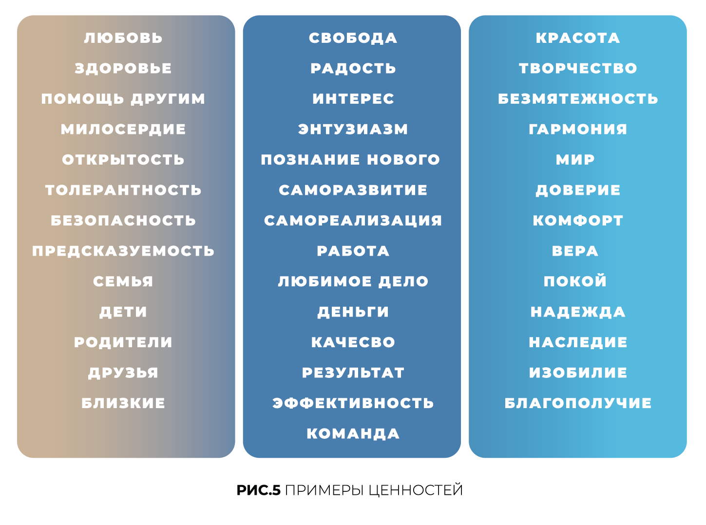 О каких ценностях идет речь? Это любовь, семья, здоровье, самореализация, личностное развитие, честность, высокое качество того, что мы делаем в профессии, лидерство в своей сфере, вера в Бога и многие другие. У каждого из нас свой набор приоритетных двух-трех ценностей на каждом этапе жизни, которыми и надо руководствоваться.