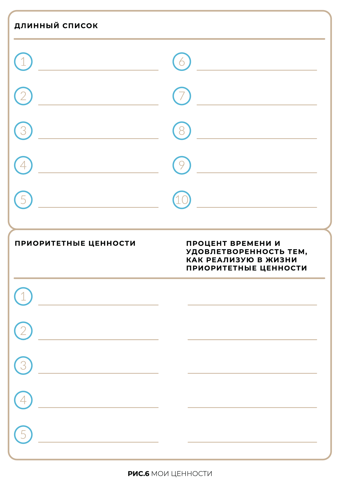 Недавно я встала перед непростым выбором: моему мужу по работе надо было переехать в другую страну. Для него это было очень важно с точки зрения его самореализации. Я свою самореализацию видела преимущественно в России и не хотела уезжать из страны. Но, немного поразмыслив, осознала, что для моего профессионального и личностного развития переезд тоже может дать очень ценный опыт. Несколько недель я мучилась и вела сама с собой бесконечные внутренние диалоги на тему того, а как же правильно мне поступить в этой ситуации. На мое счастье ровно в этот момент я редактировала эту книгу и как раз дошла в этом процессе до блока «Ценности» и прочитала список своих ценностей выше. В этот момент все мои сомнения ушли: для меня действительно семья на данном этапе жизни ценность номер один, и если нам лучше всем переехать и при этом я сохраняю возможность самореализациии, значит, мы переезжаем.