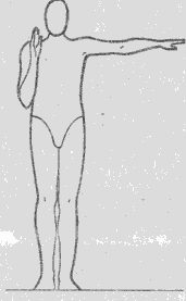 Выполнение упражнения Выпрямленные руки опускайте одновременно вперед. Левая ладонь должна быть примерно на 10 см выше, чем правая Пальцы установите следующим образом: большой и средний пальцы слегка соприкасаются, остальные выпрямлены и направлены вперед в сторону запада (см. рис. 7). Обратите внимание на то, чтобы они ни на кого не указывали.