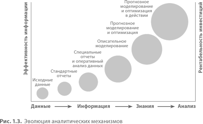 На рис. 1.3 показано развитие аналитических данных во времени. Этот путь рано или поздно пройдут все успешные организации. Вертикальная ось означает эффективность и рентабельность инвестиций в анализ данных. Большинство предприятий «застряли» в левом нижнем углу, став заложниками стандартных отчетов и низкой способности к анализу, которые предлагают некоторые инструменты, используемые в большинстве случаев отделом информационных технологий – иногда в качестве компромисса. Рисунок показывает, что если организация расположена в верхней части, то она обладает огромным потенциалом к анализу и пониманию себя, своих клиентов, поставщиков, рынков, конкурентов и других внешних факторов, начиная от государственного регулирования и заканчивая погодой.