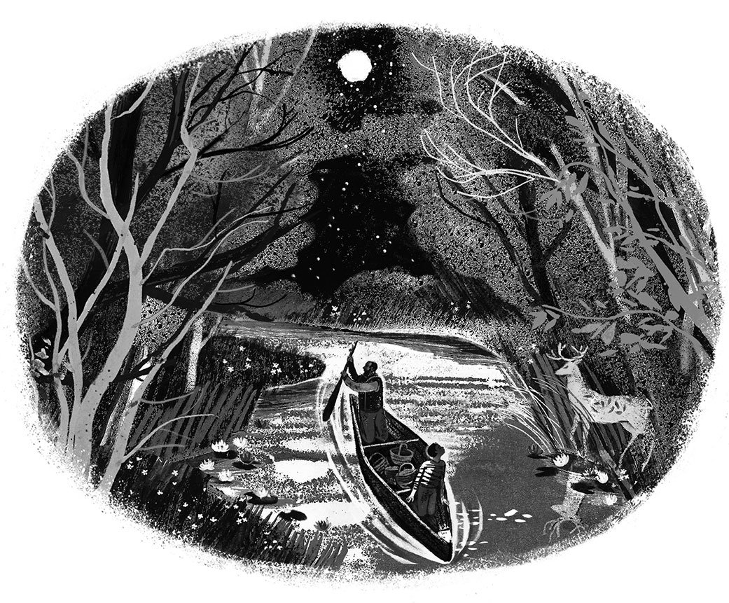 Движимый любопытством оленёнок сделал шаг вперёд, войдя передними ногами в реку. Лань, заметив его внезапное движение и стремясь защитить, повернулась и мордой оттолкнула его подальше от реки, к ивам. Оленёнок так быстро слился с ними цветом, что казалось, будто он растворился в воздухе. Мальчик сделал глубокий вдох. Лань это услышала – они были настолько близко – и волшебство развеялось. Она развернулась и тоже растворилась среди росших на берегу ив. Мальчик услышал, как весло Сига опускается в воду, и они поплыли вперёд.