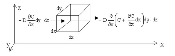 Таким образом, за счет изменения концентрации вдоль оси х в элементарный объем поступит количество вещества.