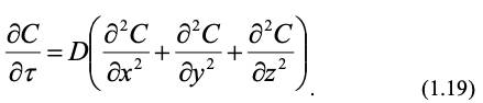 Уравнение (1.20) является следствием закона сохранения массы и 1-го закона Фика и называется 2-м законом Фика. Оно определяет поле концентраций для молекулярной диффузии в рассматриваемой среде.