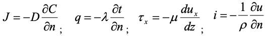 Имеется очевидное подобие выражений для конвективного переноса массы (1.22), переноса тепла (1.27) – закон Фурье и переноса количества движения (1.10), записанных ниже для одномерного потока: