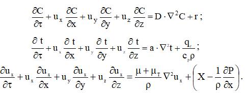 Здесь эти уравнения дополнены еще одним видом переноса – переносом электричества. Где u – градиент напряжения или электрический потенциал, ρ – удельное сопротивление электрического тока.