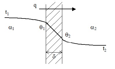 Распределение температур от одной среды к другой в стационарной теплопередаче (постоянство во времени потока тепла q) через стенку толщиной δ с коэффициентом теплопроводности приведено на Рис. 1.5.