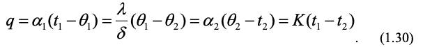 Применяя уравнение (1.29) для 1-й и 2-й среды, с учетом теплопроводности через стенку толщиной δ и общего коэффициента теплопередачи К, получим равенство выражений для стационарного теплового потока: