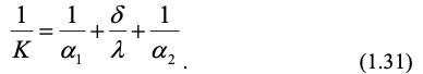 Физический смысл соотношения (1.31) заключается в том, что общее сопротивление теплопередачи через стенку 1/К равно сумме сопротивления переноса тепла от 1-й среды к стенке 1/α1, термосопротивления стенки δ/ и сопротивления переноса тепла от стенки ко 2-й среде 1/α2.
