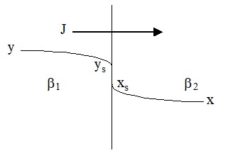 Значения концентраций на границе xs и уs трудноопределимы, поэтому записывают другое выражение диффузионного потока для коэффициентов массопереноса для первой среды К1 и для второй К2 через соответственно равновесные концентрации x* и y*.