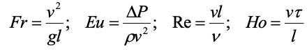 Эти соотношения после подстановки констант подобия дают выражения соответствующих критериев подобия Фруда, Эйлера, Рейнольдса и гомохнонности. Так для критерия Фруда .