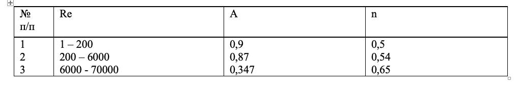 Величины коэффициентов А и n в уравнении (1.90) зависят от режима движения сушильного агента, определяемого критерием Рейнольдса. Эта зависимость в форме таблицы представлена ниже.