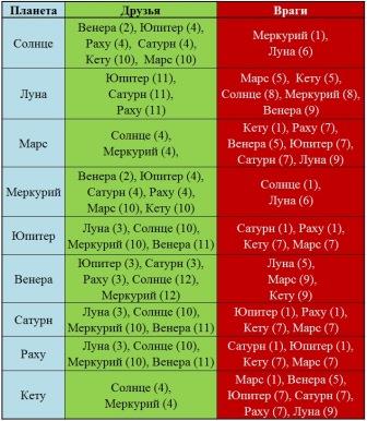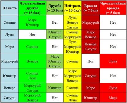 В вопросе взаимоотношениях планет европейская и индийская астрологические традиции опять расходятся. Так, например, если в европейской традиции Марс является врагом всех планет, за исключением Венеры, так как только Венера может смягчить агрессию Марса, то Джйотиш и здесь имеет собственное видение. В его основе лежат сведения о естественных отношениях планет, отражённые в нижеследующей таблице (воспроизведено из Брихат-Парашара-Хора-Шастра, далее – БПХШ, при ссылке используется [11]):