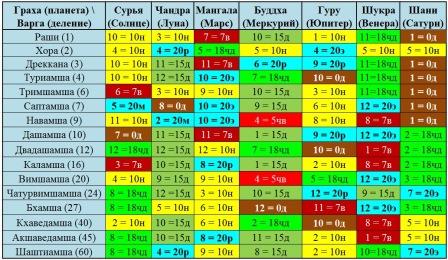 Глоссарий для таблицы: 20э – 20 баллов, экзальтация; 20м – 20 баллов, Мулатрикона; 20р – 20 баллов, собственное раши (созвездие); 18чд – 18 баллов, чрезвычайный друг; 15д – 15 баллов, друг; 10н – 10 баллов, нейтраль; 7в – 7 баллов, враг; 5чв – 5 баллов, чрезвычайный враг; 0д – 0 баллов, дебилитация. Попадание планеты в созвездие экзальтации, мулатриконы, собственное, дебилитации выделено в таблице жирным шрифтом.