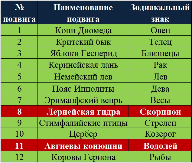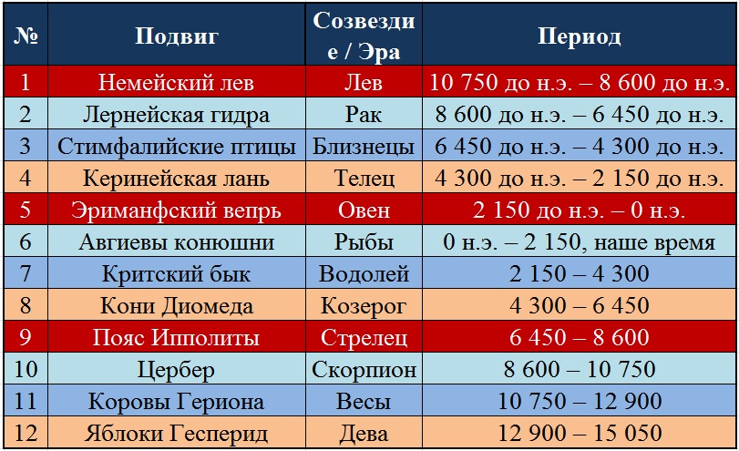 сводная таблица соотнесений продолжительности астрологических эр с подвигами Геракла будет выглядеть следующим образом:
