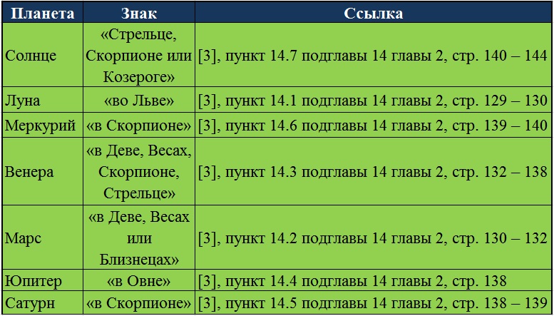 Координаты планет в «гороскопе подвигов Геракла» по юлианскому календарю