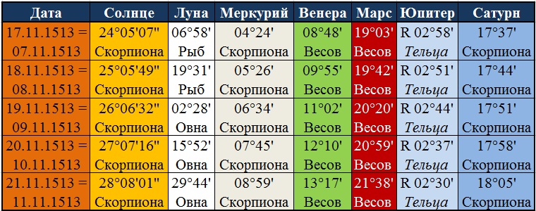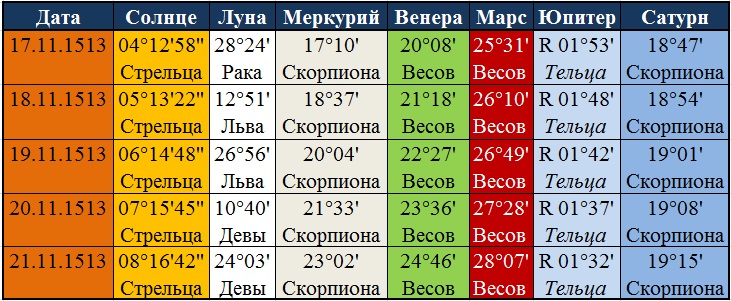 Но Юпитер-то в любом случае не «попадает» в Овен, как это рассчитали апологеты «новой хронологии»: в ноябре 1513 года он уже «утюжит» Телец (в таблицах его транзит по Тельцу выделен жирным курсивом)! Пусть – ретроградно, пусть – только первые градусы, но в Овен он «предательски не лезет»…