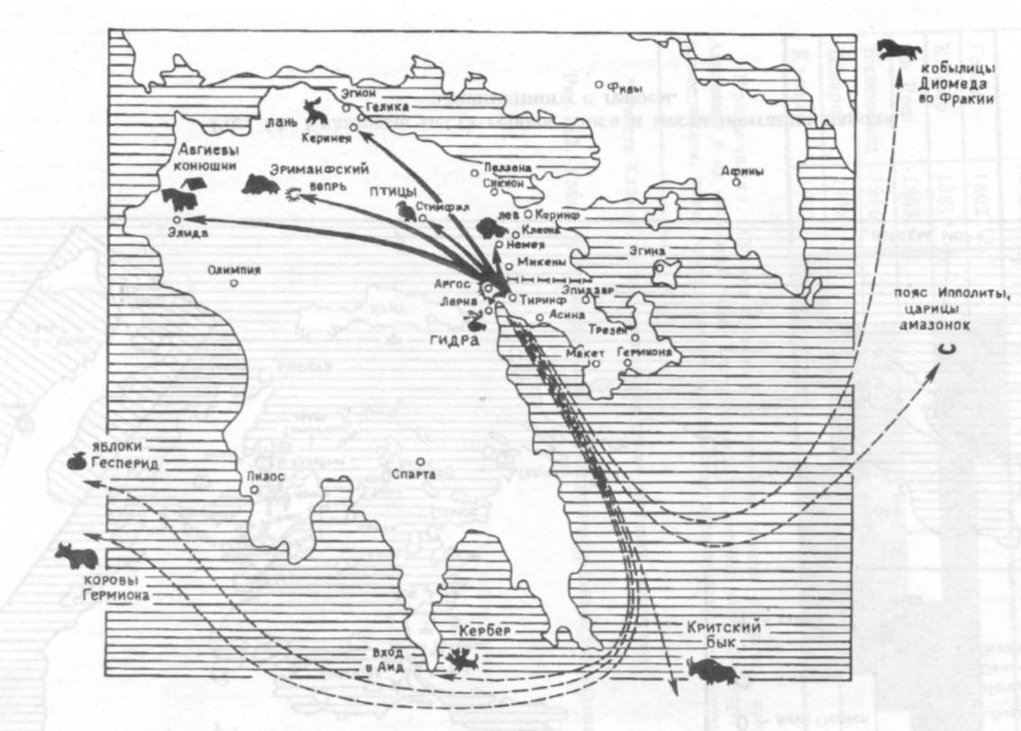Вот их далеко неполный перечень. Немея – город в Арголиде, на северо-востоке Пелопоннеса и немейские игры (Немейский лев); Лерна – город в Арголиде (Лернейская гидра); Стимфал и Эвксинский Понт – Чёрное море (!) (Стимфалийские птицы); Истр – современный Дунай, по Куну (Керинейская лань); гора Эриманф и город Псофис (Эриманфский вепрь); Элида – северо-запад Пелопоннеса и олимпийские игры (Авгиевы конюшни) и многое другое.