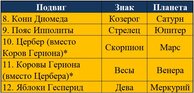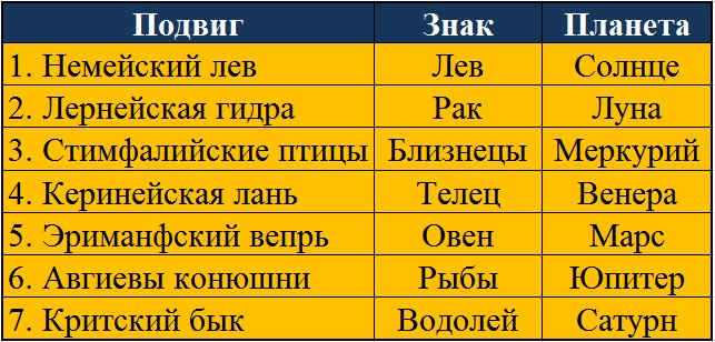 В-четвёртых, не стоит забывать, что на Критском быке «закончились» планеты, но подвиги-то продолжаются. Иными словами, планет всего семь, а подвигов-то – двенадцать… И если мы продолжим таблицу по принципу управления планет знаками,