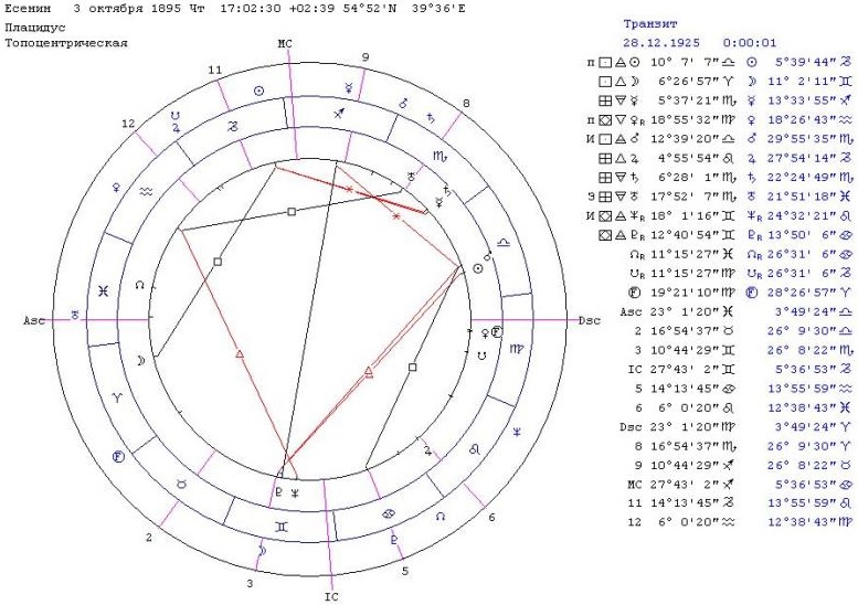 Однако не только описание сабианского градуса стало ориентиром исследовательского вектора. Ключевую роль вкупе с этим описанием сыграла транзитная карта смерти Есенина.