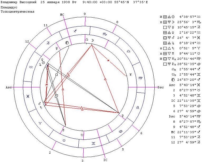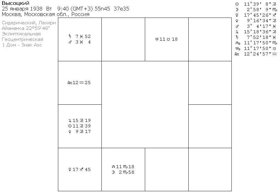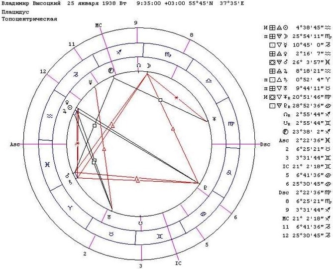 Вывод по результатам ректификации: Владимир Высоцкий родился в Москве 25 января 1938 года приблизительно в 09 час 35 минут. Основные оси гороскопа: Asc – 3-й градус Рыб, МС – 22-й градус Стрельца.